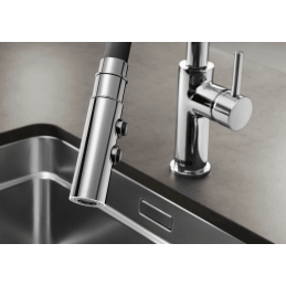 Blanco Catris-S Flexo kombinuje klasické línie s moderným poloprofesionálnym vzhľadom a funkčnosťou. Flexibilná čierna silikónová hadica umožňuje maximálnu voľnosť pohybu, zatiaľ čo dvojitá sprška ponúka dokonalý komfort pri každodennej práci v kuchyni.
