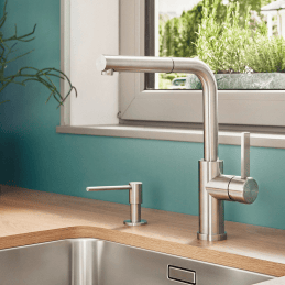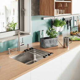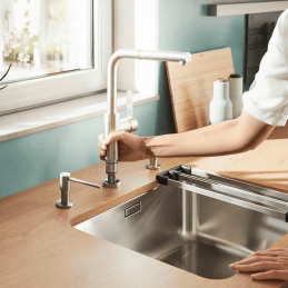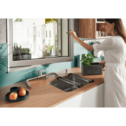 Blanco Lanora-S-F je prémiová kuchynská batéria určená na inštaláciu pod okno, ktorá spája moderný dizajn, vysokú funkčnosť a úspornú prevádzku. Je vyrobená z masívnej nerezovej ocele s matným povrchom a vďaka premyslenému sklopnému mechanizmu umožňuje bezproblémové otváranie okna nad drezom.