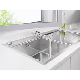 Blanco Laressa-F je elegantná a vysoko funkčná jednopáková kuchynská batéria, navrhnutá špeciálne pre umiestnenie pred okno. Jej charakteristický tvar výtoku do písmena L zvyšuje komfort pri každodennom používaní a zároveň umožňuje jednoduché sklopenie batérie pri potrebe otvorenia okna.