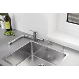 Blanco Linus-F je elegantná kuchynská batéria určená na inštaláciu pod okno, ktorá spája čistý minimalistický dizajn s praktickou funkčnosťou. Ovládanie je jednoduché a rýchle – batériu stačí zdvihnúť a položiť nabok, čím bez problémov otvoríte okno nad drezom.