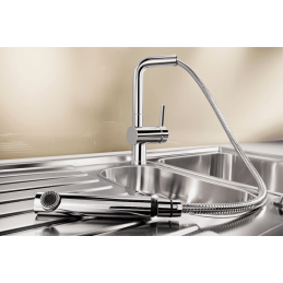 Blanco Linus-S je štýlová kuchynská batéria s vysúvateľnou sprškou, ktorá vyniká minimalistickým a nadčasovým dizajnom. Je ideálnou voľbou pre moderné kuchyne, kde sa kladie dôraz na čisté línie, praktické využitie a jednoduchú údržbu. Integrovaná sprška výrazne uľahčuje umývanie zeleniny, kuchynského náradia aj čistenie drezu.