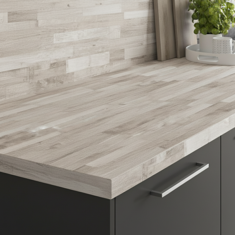 👉 Pracovná doska KRONOSPAN Linen Block Wood / K029 SU je skvelou voľbou pre tých, ktorí hľadajú prirodzený, svetlý a moderný dekor s vysokou odolnosťou a dlhou životnosťou – dokonale ladí s bielymi, šedými aj drevenými kuchyňami.