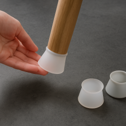 Kryty sú vyrobené z mäkkého a pružného silikónu, ktorý sa ľahko prispôsobí tvaru nohy stoličky. Spodná časť je opatrená mäkčenou plstou, ktorá umožňuje plynulý pohyb stoličky bez poškodenia povrchu. Transparentný matný povrch pôsobí decentne a esteticky v každom interiéri.