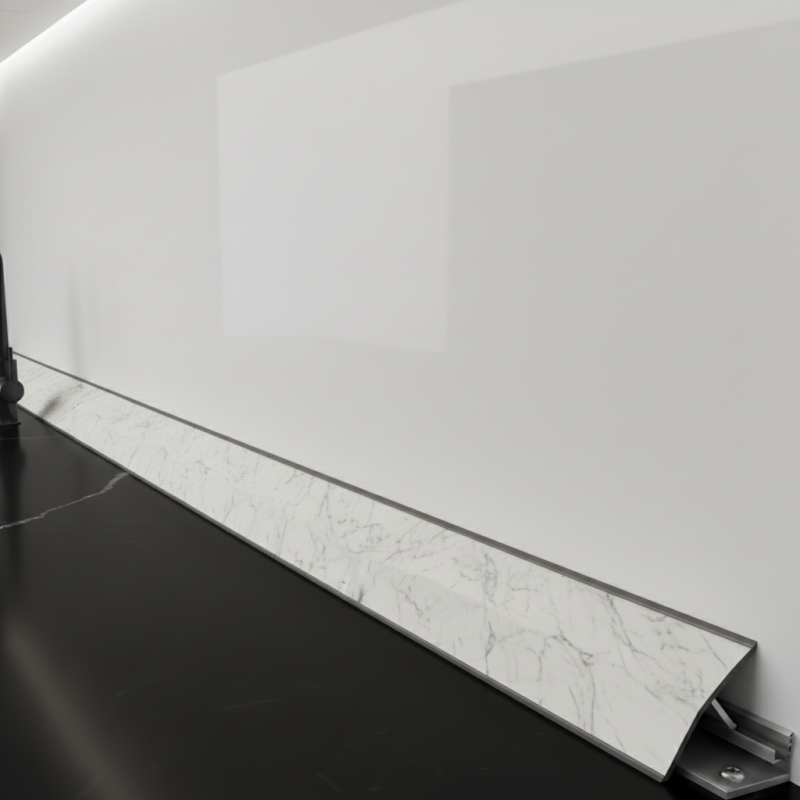 Pozostáva z dvoch častí – spodná časť sa naskrutkuje alebo nalepí na pracovnú dosku a horná sa následne zacvakne do spodnej, čím vznikne čisté, presné a estetické zakončenie v rovnakom dekore ako pracovná doska.