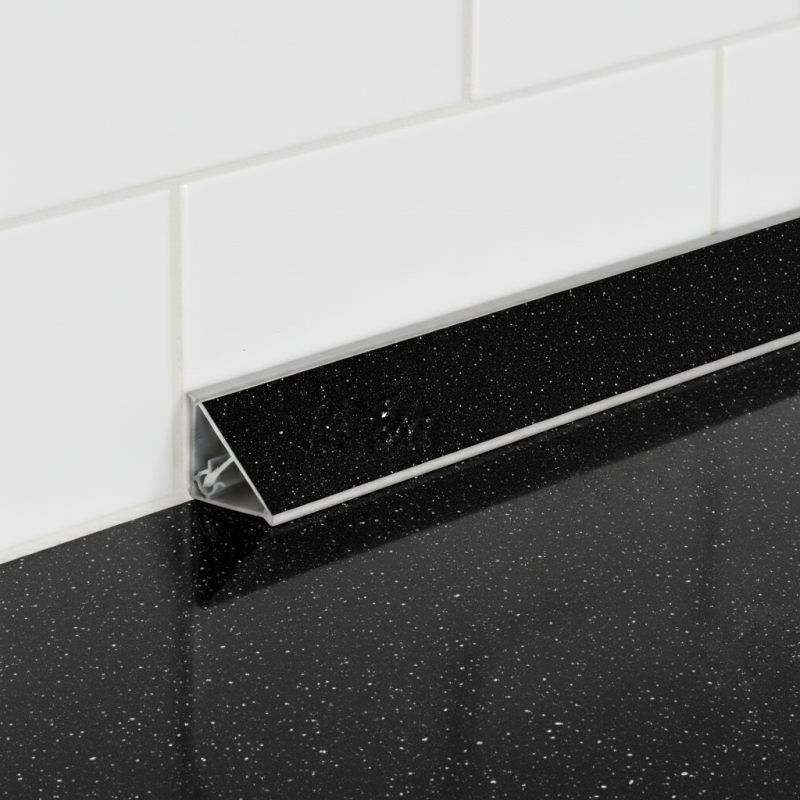 Luxusná a výrazná tesniaca lišta KRONOSPAN v dekore Andromeda Čierna lesklá (K218 GG) je určená na profesionálne a precízne zakončenie pracovných dosiek. Lišta spoľahlivo utesňuje spoj medzi pracovnou doskou a stenou, čím účinne zabraňuje prenikaniu vody a nečistôt, a zároveň dodáva kuchyni exkluzívny a elegantný vzhľad čierneho mramoru s jemnými trblietkami a vysokým leskom.