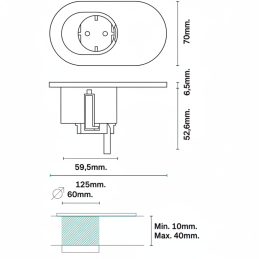 Zásuvka je určená na zapustenie do nábytku alebo pracovnej dosky. Vďaka malej inštalačnej hĺbke je vhodná aj do tenších materiálov.