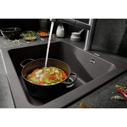 Blanco Naya 5 je praktický granitový kuchynský drez, navrhnutý pre efektívne využitie priestoru v menších až stredne veľkých kuchyniach. Vďaka požiadavke na minimálnu šírku skrinky 50 cm a absencii odkvapovej plochy ponúka maximálnu pracovnú plochu na linke pri zachovaní komfortnej veľkosti vaničky.