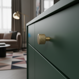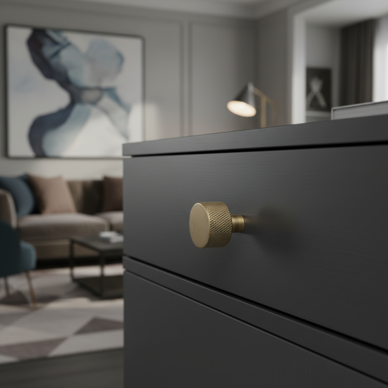 Typická ryhovaná (knurled) textúra zvýrazňuje industriálny štýl a zároveň zlepšuje úchop pri používaní. Starozlaté prevedenie pôsobí teplo, nadčasovo a dokonale vynikne na tmavých aj svetlých dekoroch nábytku.