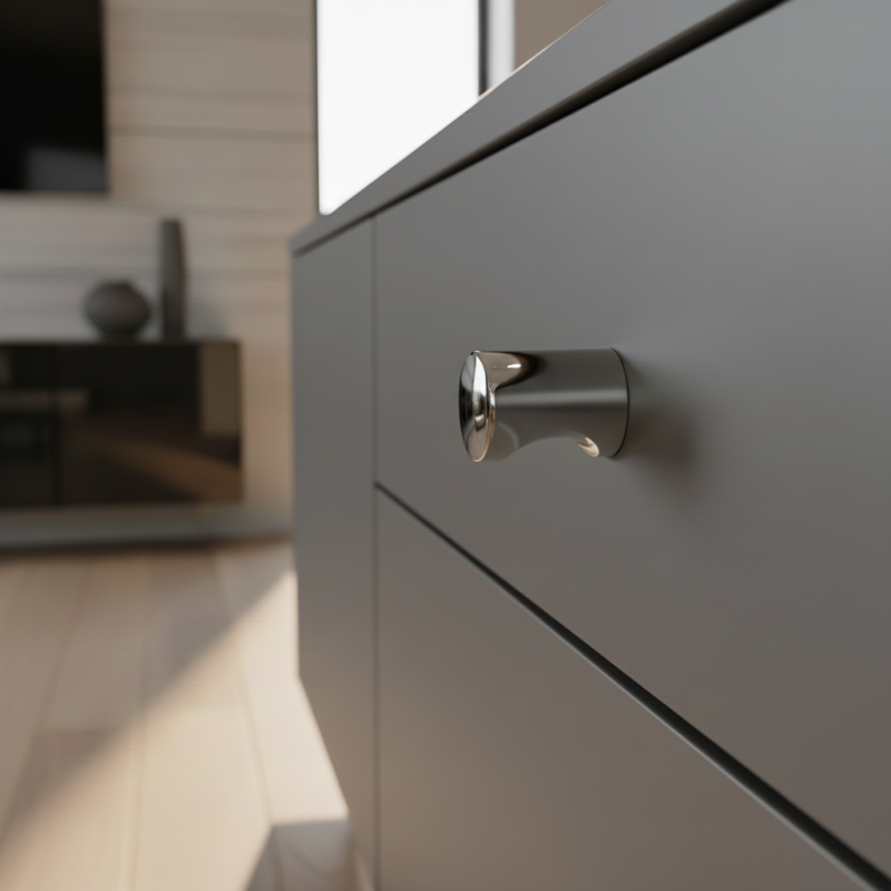 Knopka LIVIA v povrchovej úprave lesklý chróm kombinuje moderný tvar, praktickú funkčnosť a luxusný vzhľad. Jej kompaktný valcovitý dizajn doplnený o ergonomické bočné vybratie poskytuje príjemné a pevné uchopenie, čo uľahčuje otváranie dvierok či zásuviek.