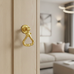 Elegantná rustikálna úchytka typu knopka CORTINA v zlatom lesklom prevedení je výrazným dekoratívnym doplnkom pre klasický a vintage nábytok. Bohato tvarovaný dizajn s pohyblivým spodným úchopom dodáva nábytku luxusný vzhľad a zvýrazňuje jeho štýl.