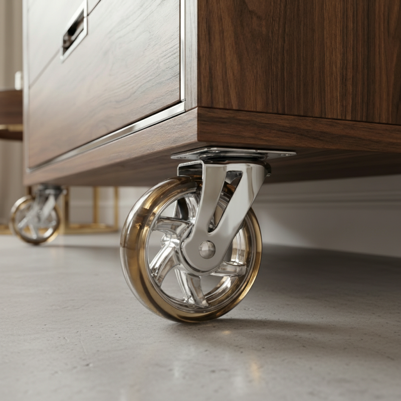 Kvalitné otočné nábytkové koliesko v prevedení transparentná hnedá s chrómovaným držiakom je ideálne pre rôzne typy nábytku – skrinky, stolíky, regály či mobilné kontajnery. Moderný dizajn s priehľadným kolieskom pôsobí elegantne a zároveň prakticky.