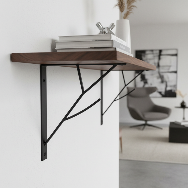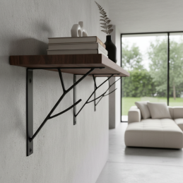 Držiak FOREST v elegantnej čiernej farbe kombinuje funkčnosť s jemným dekoratívnym prvkom. Originálne tvarovaná výstuha pripomínajúca vetvu pôsobí esteticky a zároveň pridáva konštrukcii pevnosť. Ideálna voľba pre interiéry, kde chcete spojiť praktickosť a jemný dizajnový detail.