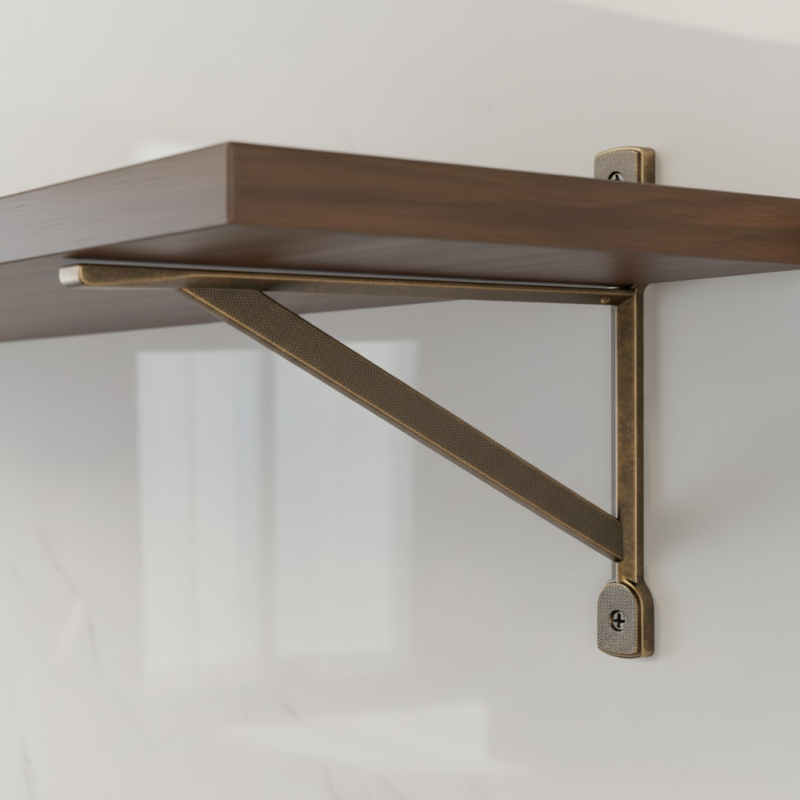 Držiak ZAIRA v povrchovej úprave staromosadz prináša do interiéru teplý, elegantný a jemne industriálny akcent. Je ideálny pre moderné aj rustikálne priestory, kde vynikne jeho patinovaný vzhľad a masívne kovové spracovanie. Vďaka vysokej stabilite a nosnosti je vhodný na praktické aj dekoratívne police v rôznych miestnostiach.