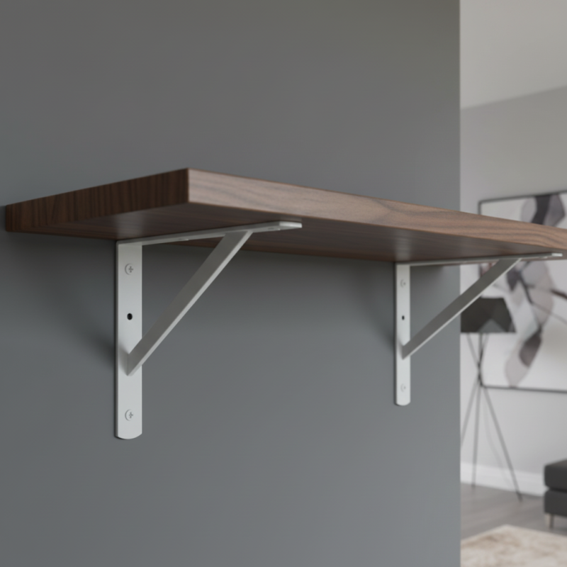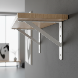 Kovový držiak police v modernom industriálnom dizajne. Určený na montáž na stenu, vhodný pre drevené aj laminované police. Robustná konštrukcia so šikmou výstuhou zabezpečuje vysokú pevnosť a stabilitu.