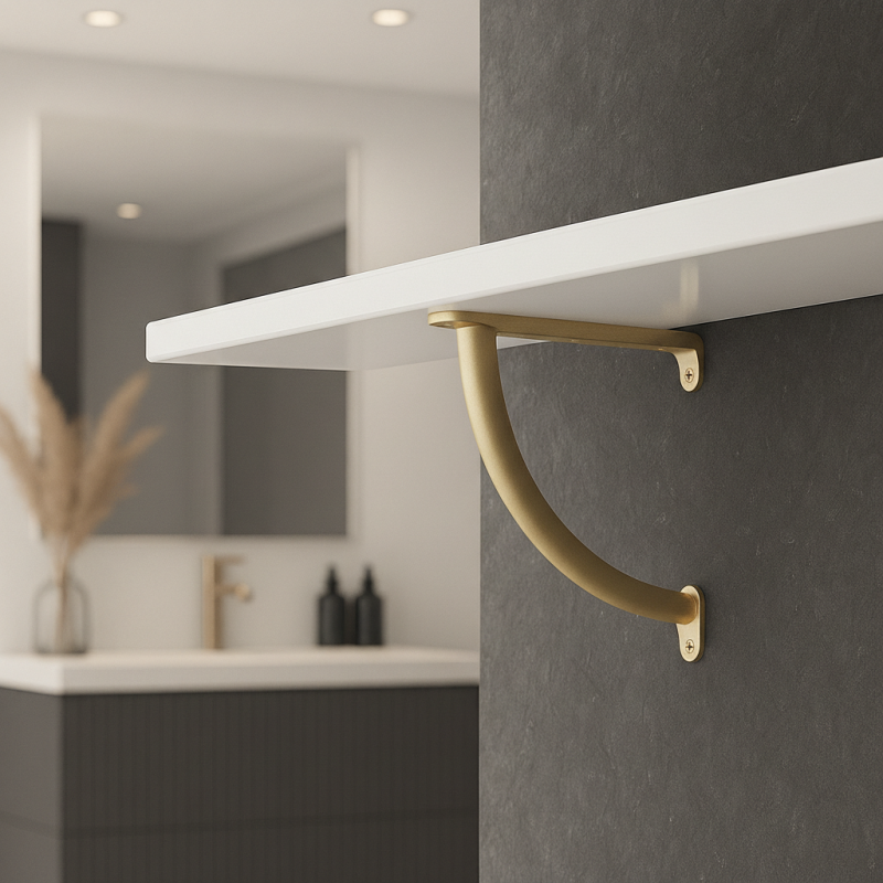 Elegantný a dizajnový držiak police v luxusnom zlatom prevedení, ktorý spája moderný vzhľad s vysokou nosnosťou. Vďaka robustnej kovovej konštrukcii je ideálny pre väčšie a hlbšie police, kde je potrebná maximálna stabilita a spoľahlivosť.