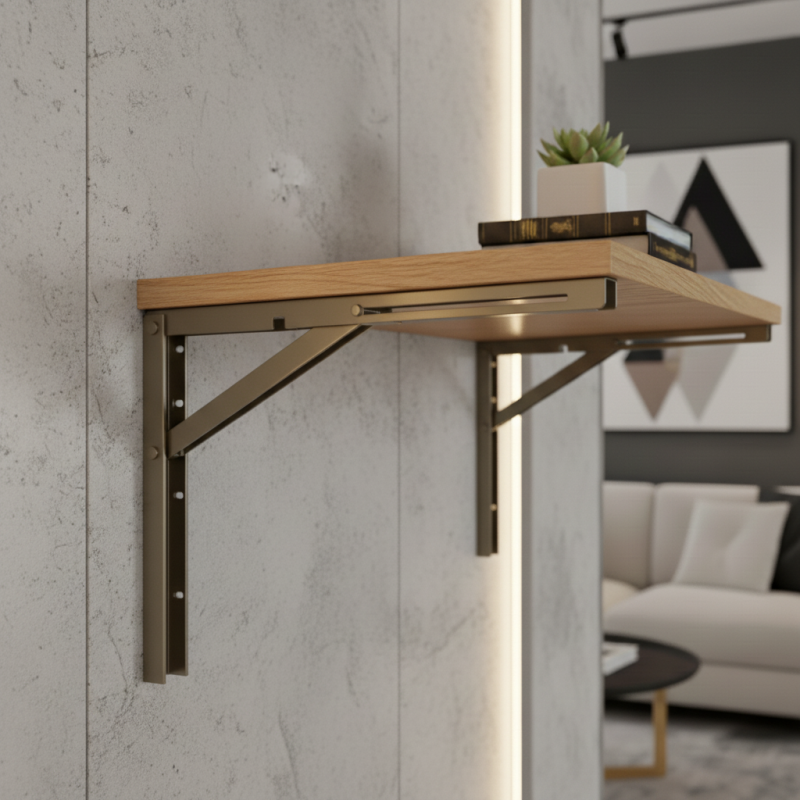 Univerzálna sklopná konzola vhodná pre police, skladacie stolíky, pracovné dosky či barové pulty. Vďaka pevnej kovovej konštrukcii a kvalitnému saténovému povrchu ponúka moderný vzhľad, vysokú odolnosť a praktické využitie v každom interiéri.