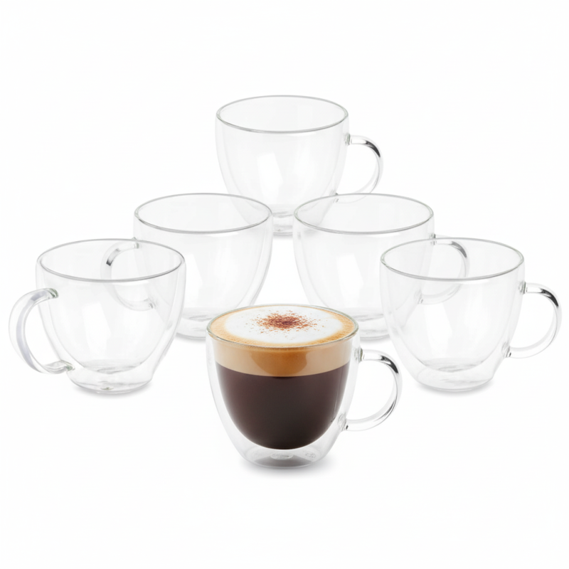 Dvojitá sklenená stena udrží váš nápoj dlhšie teplý alebo studený, pričom vonkajší povrch pohára zostáva príjemne chladný na dotyk. Transparentný dizajn dodáva pohárom moderný vzhľad a umožňuje naplno vychutnať vizuálny efekt kávy, čaju či iných nápojov.