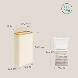 S objemom 60 litrov a rozmermi 42 x 22,5 x 70,5 cm je tento kôš dostatočne veľký, aby pojal týždennú bielizeň jednej osoby. Už sa nemusíte trápiť každodenným zhromažďovaním prádla, pretože tento kôš vám poskytne dostatok miesta a organizácie, ktoré potrebujete.