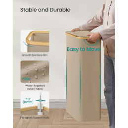 Košík na bielizeň je vyrobený z kvalitnej 600D hrubej látky Oxford, ktorá je odolná voči vode a roztrhnutiu, a zároveň sa ľahko čistí. Vnútorná štruktúra je podopretá sklolaminátovými tyčami, ktoré zaisťujú stabilitu a odolnosť pri pravidelnom používaní. Tento košík je navrhnutý tak, aby vám verne slúžil po mnoho rokov.