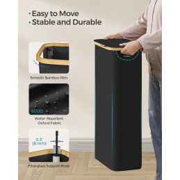 Košík na bielizeň je vyrobený z kvalitnej 600D hrubej látky Oxford, ktorá je odolná voči vode a roztrhnutiu, a zároveň sa ľahko čistí. Vnútorná štruktúra je podopretá sklolaminátovými tyčami, ktoré zaisťujú stabilitu a odolnosť pri pravidelnom používaní. Tento košík je navrhnutý tak, aby vám verne slúžil po mnoho rokov.
