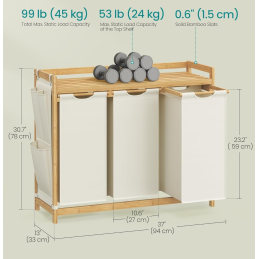 Priestranný a elegantný kôš na bielizeň SPA HARMONY TRIO ponúka praktické riešenie pre domácnosti, ktoré chcú mať bielizeň prehľadne roztriedenú. Kombinácia pevného bambusového rámu a troch textilných vakov v bielej farbe vytvára harmonický prírodný vzhľad vhodný do kúpeľne aj práčovne.