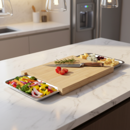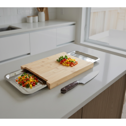 Praktická a dizajnová bambusová doska na krájanie s integrovanými nerezovými nádobami je ideálnym pomocníkom do modernej kuchyne. Premyslená konštrukcia umožňuje pohodlnú prípravu surovín bez neporiadku – nakrájané potraviny jednoducho zosuniete priamo do vyberateľných nádob.