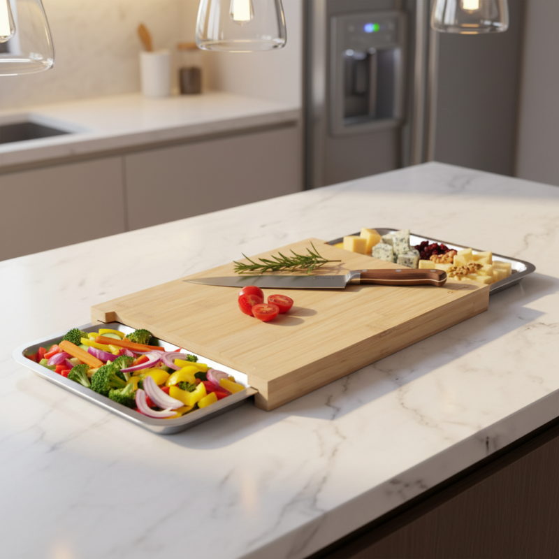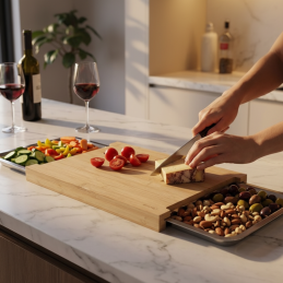 Bambusová doska na krájanie s nádobami je ideálnou kombináciou praktickosti, estetiky a hygieny, ktorá spríjemní každodennú prácu v kuchyni.