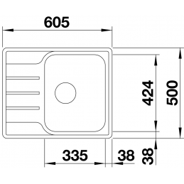 Drez s rozmermi 605 × 500 mm je určený na montáž na pracovnú dosku alebo do roviny (IF) a je vhodný pre spodné skrinky s minimálnou šírkou 45 cm.