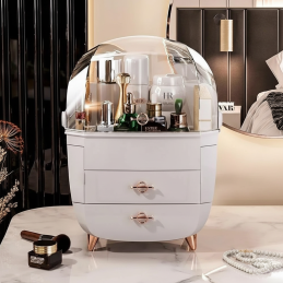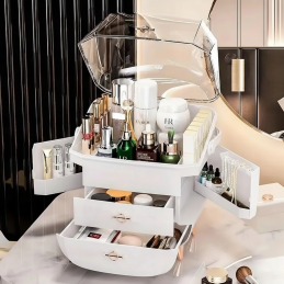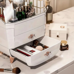 Organizér ponúka veľkú úložnú kapacitu vďaka priestranným zásuvkám a veľkému hornému úložnému priestoru s priehľadným ochranným krytom, ktorý chráni kozmetiku pred prachom a zároveň umožňuje rýchly a jednoduchý prehľad o uložených produktoch. Bez problémov pojme parfumy, krémy, balzamy, make-up aj starostlivosť o pleť.