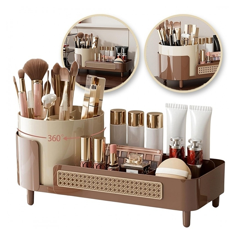 Organizér je vybavený otočným držiakom na štetce, ktorý sa otáča o 360°, čo umožňuje rýchly a pohodlný prístup ku všetkým uloženým pomôckam. Spodná časť ponúka praktické priehradky vhodné na rúže, krémy, make-up, parfumy alebo drobnú kozmetiku.
