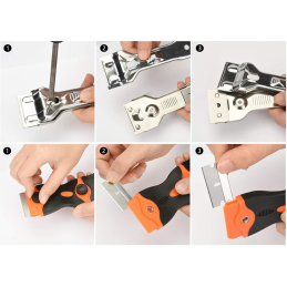 Balenie obsahuje 5 ostrých kovových čepelí na odolné nečistoty a 1 plastovú čepeľ na citlivé povrchy. Čepele sa dajú jednoducho a rýchlo vymeniť.