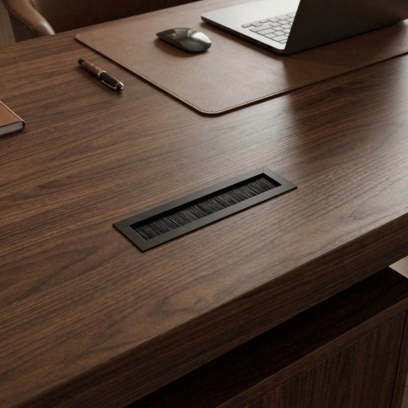 Integrovaná kefová výplň zabraňuje prenikaniu prachu a zároveň umožňuje pohodlné vedenie viacerých káblov.