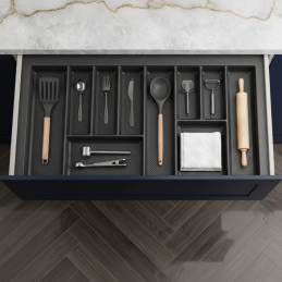 Príborník CRISTALL je praktický organizér na príbory a kuchynské pomôcky do zásuvky. Vďaka protišmykovému povrchu zostane obsah stabilne na svojom mieste a moderná antracitová farba zapadne do každej kuchyne.