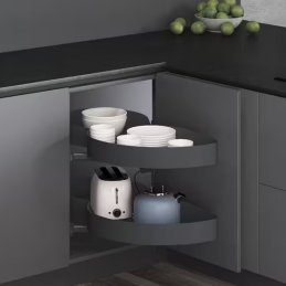 Praktický systém do rohovej skrinky s dvoma výsuvnými poličkami s plným dnom.