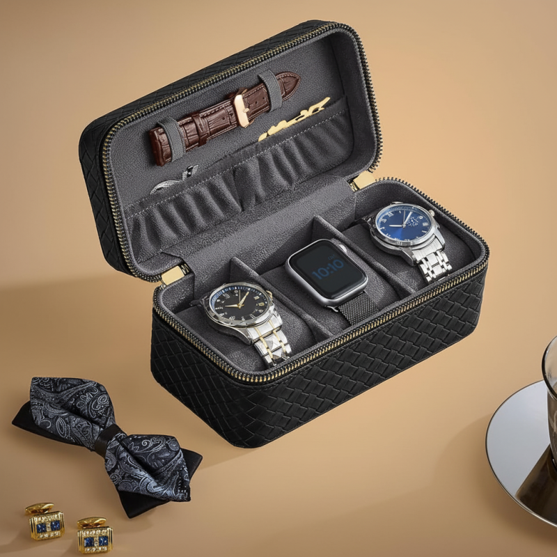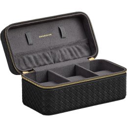 Doprajte svojim hodinkám štýlovú a bezpečnú ochranu s luxusným cestovným boxom BUGATI TRAVEL. Elegantné čierno-zlaté prevedenie, prémiový povrch s pletenou textúrou a mäkké velúrové vnútro zabezpečia, že vaše hodinky a doplnky budú uložené v bezpečí a bez poškodenia – či už doma, alebo na cestách.