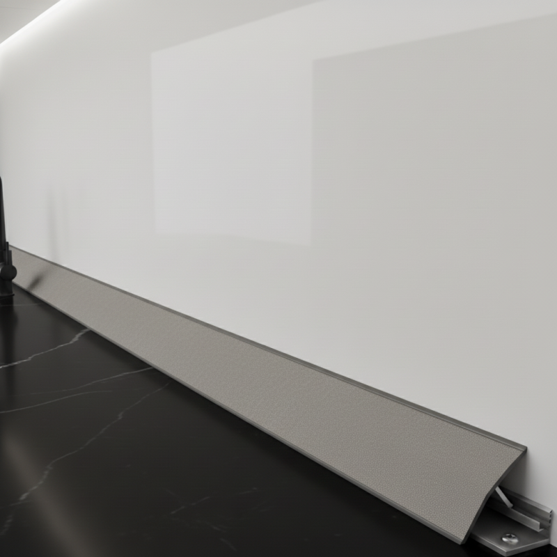 Pozostáva z dvoch častí – spodná časť sa naskrutkuje alebo nalepí na pracovnú dosku a horná sa následne zacvakne do spodnej. Vďaka tomu vzniká čisté a estetické zakončenie s realistickým kovovým efektom.