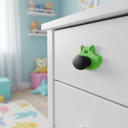 Úchytka HELLO / Zelená – čierna je skvelou voľbou pre rodičov, ktorí chcú spojiť bezpečnosť, hravosť a funkčnosť nábytku v detskej izbe. Dodá priestoru farby, príjemný pocit a bezpečné používanie každý deň.