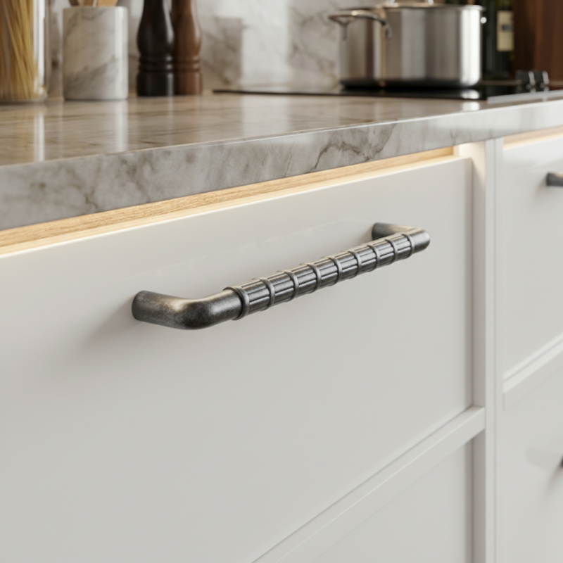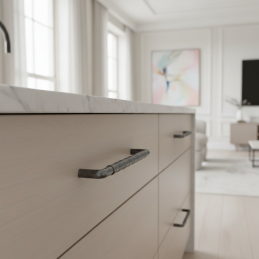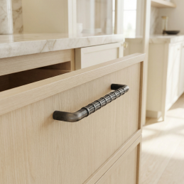 Dizajnová úchytka TAU v prevedení staročierna je výrazným detailom, ktorý dodá nábytku autentický industriálny a mierne vintage charakter. Patinovaný staročierny povrch pôsobí elegantne a nadčasovo, pričom zvýrazňuje precízne spracovaný vrúbkovaný úchop.