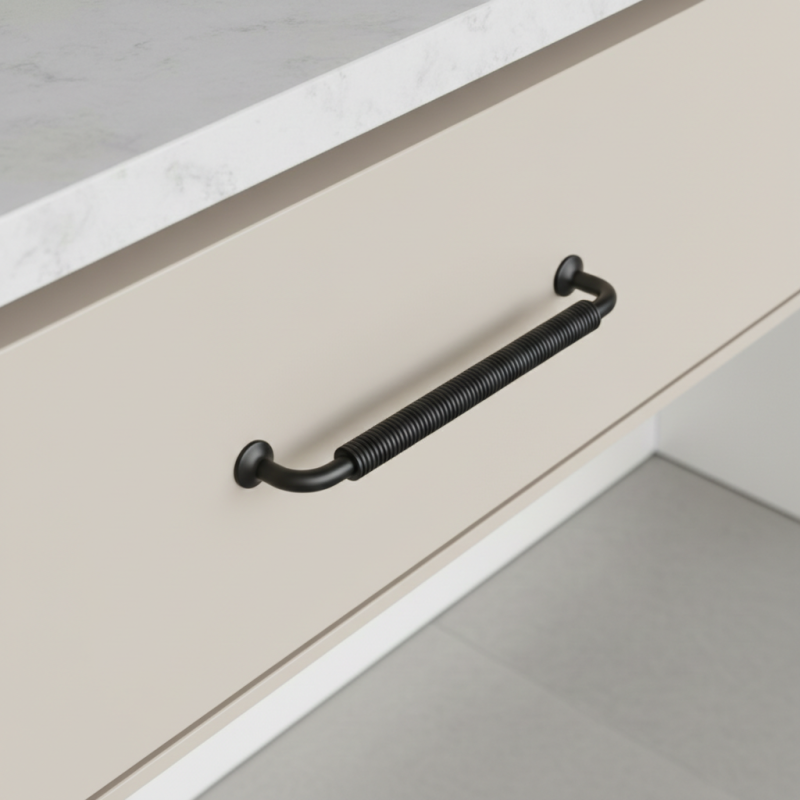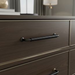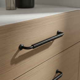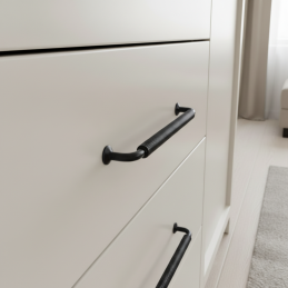 Výrazná nábytková úchytka STIGMA v prevedení čierna matná zaujme industriálnym dizajnom a detailne spracovaným vrúbkovaným úchopom. Jej robustný vzhľad a matný povrch dodajú nábytku moderný, technický charakter, vďaka čomu je ideálna pre loftové, industriálne aj moderné interiéry.