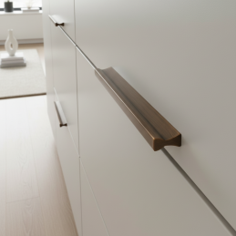 Brúsená mosadz vytvára teplý, sofistikovaný metalický efekt, ktorý sa krásne kombinuje s drevom, bielymi povrchmi aj tmavými odtieňmi. Úchytka je úzka, ale pevná a vďaka prepracovanému tvaru sa veľmi príjemne uchopuje.