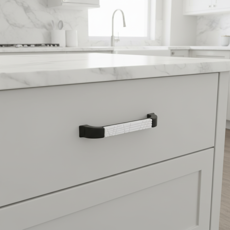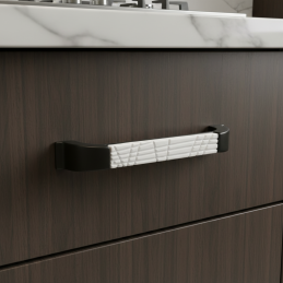 Keramická úchytka BRAGA v kombinácii čiernej matnej zinkovej zliatiny a elegantného bieleho porcelánu prináša moderný, no zároveň dekoratívny akcent pre váš nábytok. Jej výrazný kontrast tmavého kovu a reliéfne zdobeného porcelánu vytvára jedinečný dizajn, ktorý skvele vynikne v kuchyni, kúpeľni, obývačke aj na komodách či skrinkách v štýle moderného vidieka, vintage či klasickej elegancie.