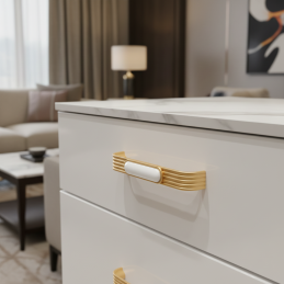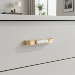 Keramická úchytka FARO v elegantnej starozlatej úprave je výrazným a dekoratívnym doplnkom, ktorý dodá nábytku noblesný a jedinečný vzhľad. Kombinácia kvalitnej zinkovej zliatiny a bieleho porcelánu vytvára harmonický kontrast, zatiaľ čo charakteristické profilovanie úchytky pridáva jemný vintage nádych.