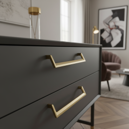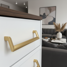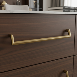 Úchytka AMORA v zlatej matnej úprave je elegantným, moderným a nadčasovým doplnkom, ktorý dodá nábytku jemný luxus bez prehnanej výraznosti. Jej čisté, geometrické línie s charakteristickým zalomením pôsobia dizajnovo a harmonicky, vďaka čomu sa hodí do moderných kuchýň, kúpeľní, obývacích izieb aj šatníkov.