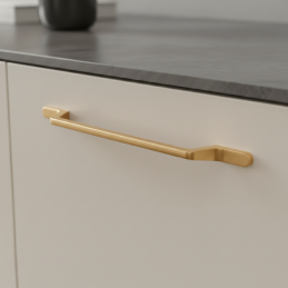Úchytka ELIDA v zlatej brúsenej úprave je elegantným a moderným doplnkom, ktorý dodá nábytku jemný luxusný akcent. Jej štíhly, dlhý tvar s jemným zalomením na koncoch pôsobí veľmi ľahko a nadčasovo, vďaka čomu sa perfektne hodí do moderných, minimalistických aj elegantných interiérov.