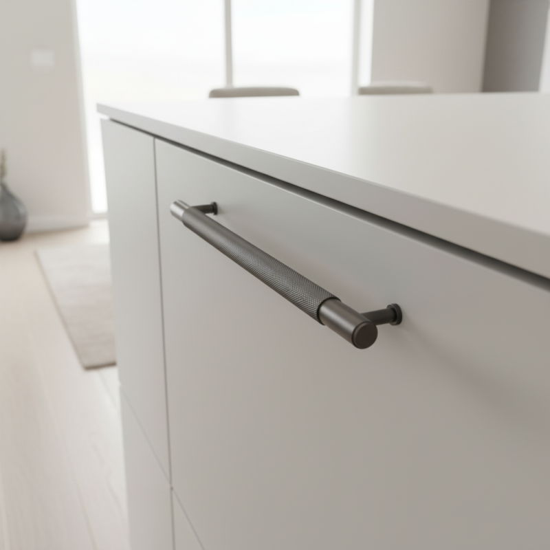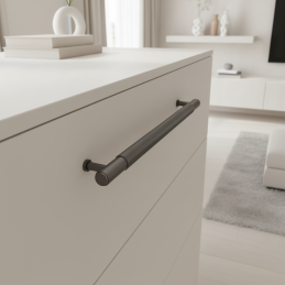 Úchytka LAYLA / Čierny grafit je moderný a technicky pôsobiaci dizajnový prvok, ktorý vyniká svojím precíznym spracovaním a industriálnym charakterom. Typickým znakom je jemne ryhovaná (knurling) stredová časť, ktorá nielen esteticky zaujme, ale zároveň zlepšuje úchop. Koncové časti majú hladký povrch, čo vytvára elegantný kontrast a vyvážený vzhľad.