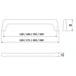 • Rozteče (vzdialenosť medzi otvormi): 128 mm / 160 mm / 192 mm / 320 mm