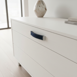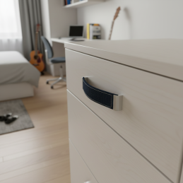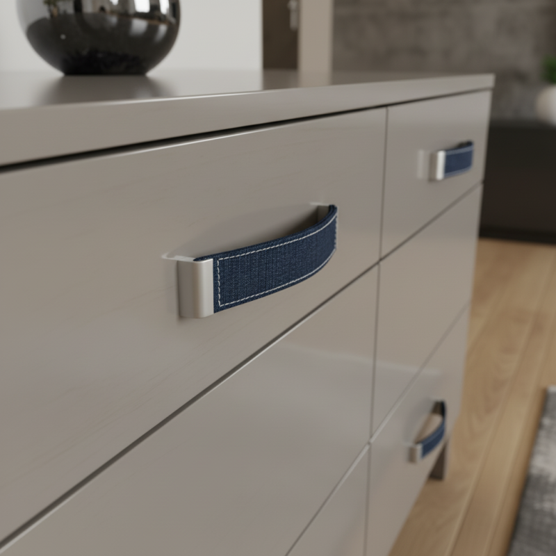 Úchytka JEANS je jedinečný dizajnový prvok, ktorý spája kovovú konštrukciu s pravou rifľovinou. Tento nezvyčajný a nápaditý kontrast dodá nábytku moderný, mladistvý a uvoľnený charakter. Ideálna voľba do detských a tínedžerských izieb, šatníkov, kreatívnych pracovných priestorov či všade tam, kde chcete vniesť kúsok originality.