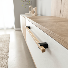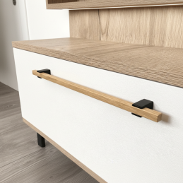 Hranatá dubová časť s krásnou kresbou dreva dodáva nábytku prirodzený akcent, zatiaľ čo čierne drevené držiaky vytvárajú jemný vizuálny kontrast bez použitia kovu. Tento model sa výborne kombinuje s knopkou ALVEA a umožňuje vytvoriť jednotný dizajn v celej miestnosti.