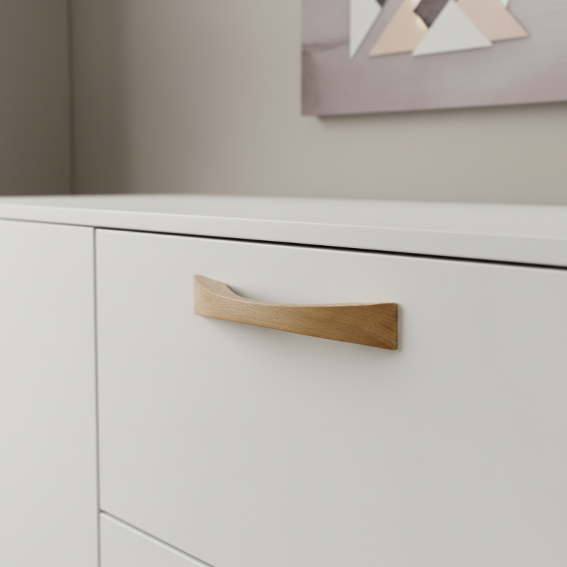 Drevená úchytka GALEOS v prevedení dub lakovaný je dizajnovým prvkom, ktorý kombinuje modernú eleganciu s pravým prírodným materiálom. Jej jemne prehnutý tvar pôsobí vzdušne a ľahko, zároveň však ponúka pohodlné uchopenie pri každodennom používaní. Lakovaný dub zvýrazňuje prirodzenú kresbu dreva a zabezpečuje dlhodobú ochranu povrchu.