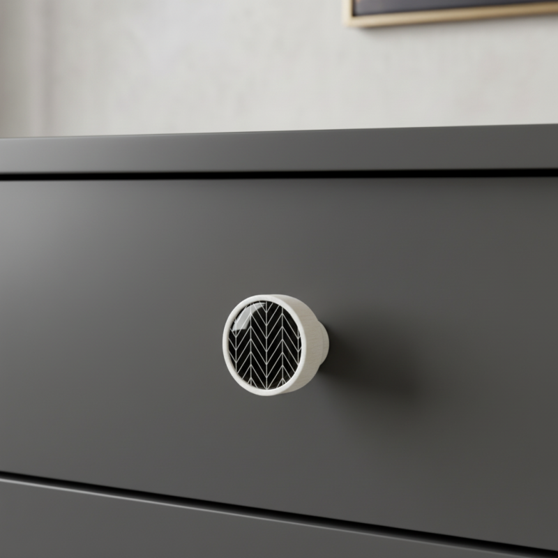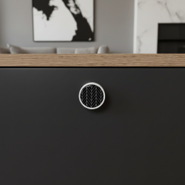 Drevená úchytka ARSIA v matnom bielom prevedení s výrazným motívom čiernej jedle predstavuje moderný a elegantný doplnok, ktorý skvele zapadne do škandinávskych, minimalistických aj prírodných interiérov. Kontrast bieleho dreveného tela a čierneho grafického vzoru vytvára nadčasový dizajn, ktorý oživí každý nábytok.